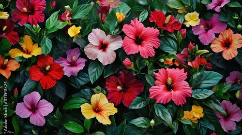 A dense cluster of colorful hibiscus flowers and leaves, forming a textured garden background in a tropical park