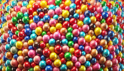A dense cluster of colorful, shiny balloons tightly packed together, slightly overlapping