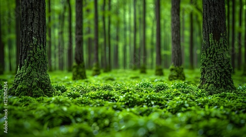 A dense evergreen forest with towering trees in 4K HD 8K wallpaper Photographic Image