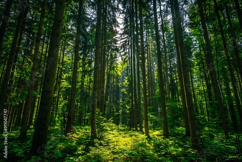 A dense forest with towering trees, their canopies forming a natural green roof, with sunlight filtering through and highlighting the undergrowth.