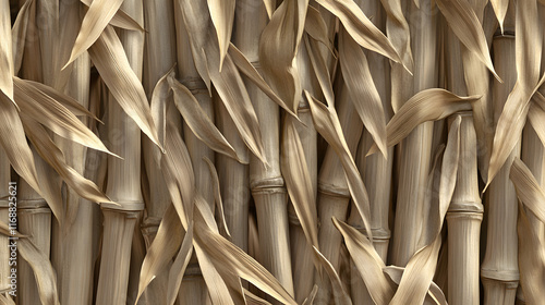 A dense thicket of dried bamboo leaves and stalks creates a textured, golden-brown background.