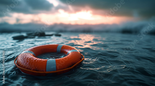 A depiction of a robust lifebuoy in the foreground, symbolizing survival and support during hurricane and flood losses, with a blurred background of storm devastation The focus is , AI Generative