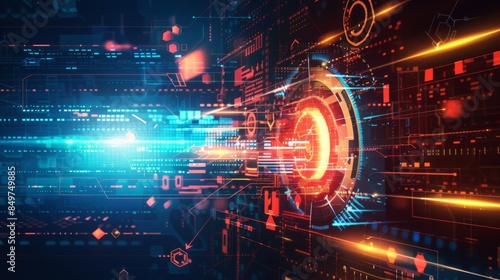 A depiction of data flow within a circuit, using red and blue neon lights to illustrate technology