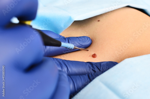 A dermatologist surgeon removes a neoplasm - a mole or nevus from the patient's abdomen with a radio wave knife. Aesthetic surgery, prevention of melanoma.