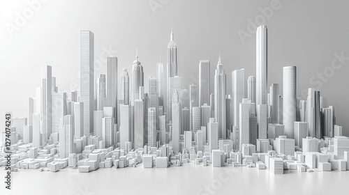 A description and keywords for the image are provided, reading Minimalist white city skyline model