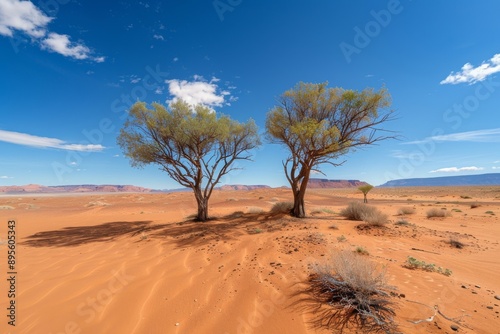 A desert composition featuring resilient trees captures the stark beauty and adaptability of life in arid conditions.