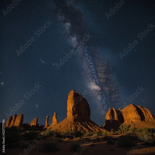 "A desert night sky filled with stars, framed by the silhouette of towering sandstone formations."