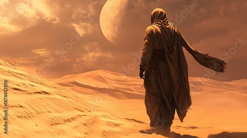 A desert nomad outfit with flowing robes and head wrap in sand dunes