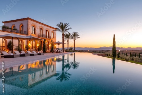 A desert oasis surrounded by dunes, with vibrant green palm trees and crystal-clear water reflecting a cloudless sky