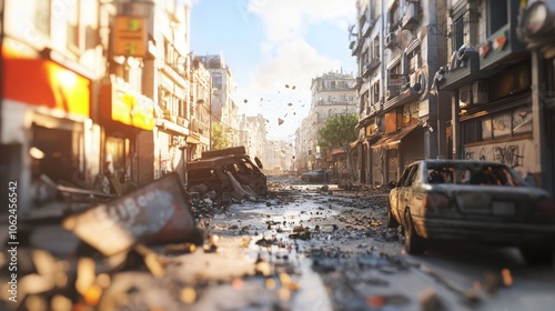 A deserted city street after a disaster, with debris and wrecked vehicles.