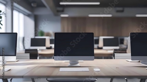 A deserted modern office of an IT company with turned off desktop, facing directly into the camera, Generative AI illustrations.