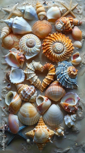 A design made by arranging sea shells on the beach.
