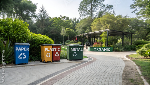 A designated recycling area with clearly marked bins stands along a paved path, surrounded by lush greenery, emphasizing waste management and ecological consciousness