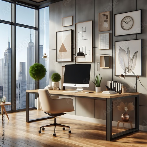 A desk with a computer and a chair in front of a window image art photo lively.