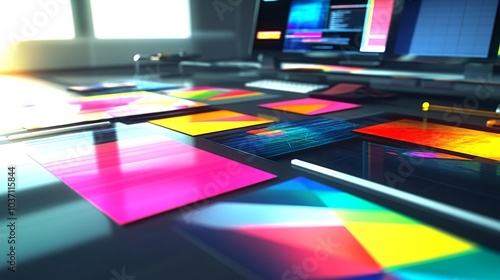 A desk with a computer screen displaying graphics and colorful designs, with various papers and other design elements scattered around.
