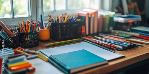 A desk with a notebook, pencils, and other stationery.