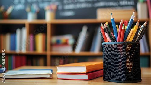 A desk with books and a pencil holder filled with colorful pencils in front of a bookshelf backdrop