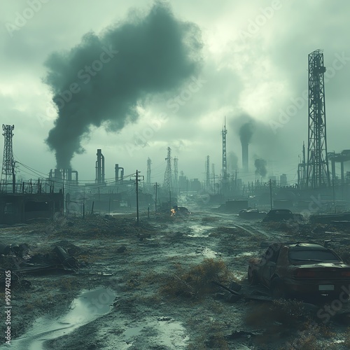 A desolate industrial landscape shrouded in smog, showcasing abandoned vehicles and towering factories emitting dark smoke.