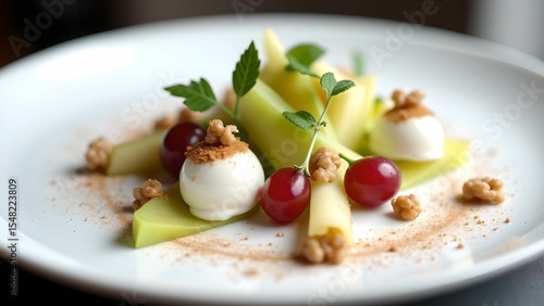 A dessert of fresh fruit with cream, mint leaves and a crunchy filling, served on a white plate