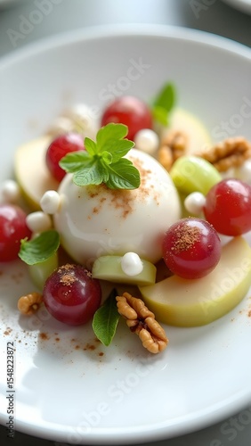 A dessert of fresh fruit with cream, mint leaves and a crunchy filling, served on a white plate
