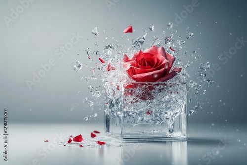 A detailed 3D image of a rose frozen in a cracked block of ice, symbolizing heartbreak and unfulfilled love