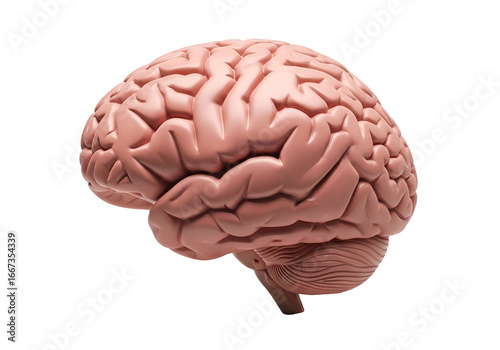 A detailed anatomical depiction of a human brain, presented in a light pinkish-tan hue against a black background.