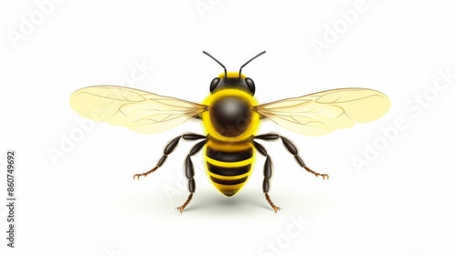 A detailed and realistic illustration of a bee from the front view, showcasing its intricate features and vibrant yellow and black coloration, all set against a clean white background.