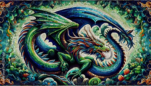 A detailed and vibrant image of a mythical dragon, its scales a mix of deep greens and blues, depicted in a colorful mosaic style.