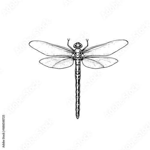 A detailed black and white illustration of a dragonfly with its wings spread wide, showcasing intricate venation and segmented body.