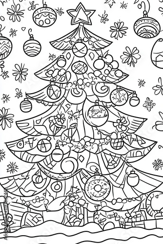 A detailed Christmas tree waiting to be colored, adorned with various ornaments, flowers, and a star on top, inviting creativity during the holiday season