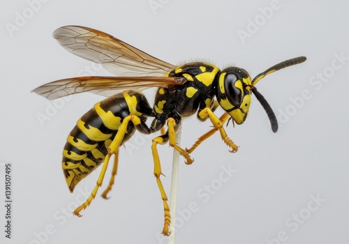 A detailed close up of a yellow jacket wasp showing its distinctive black and yellow striped body and wings