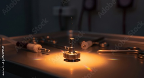 A detailed close up shot of a spinal needle illuminated against a metallic tray in surgery