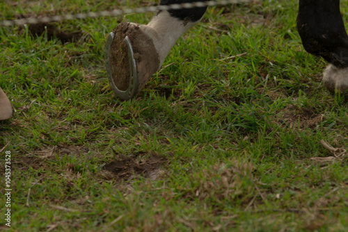 A detailed close up view of a horses hoof resting on a vibrant grassy field, surrounded by various elements of nature