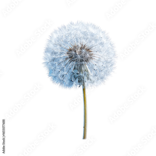 A detailed close-up captures a fluffy, spherical dandelion seed head atop a slender, green stem against a stark black backdrop
