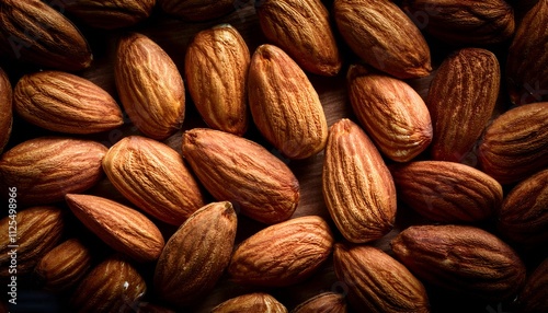 A detailed close-up image showcasing whole almonds with rich brown shells. The lighting highlights the natural textures, emphasizing the almonds' earthy tone and wholesome appearance.