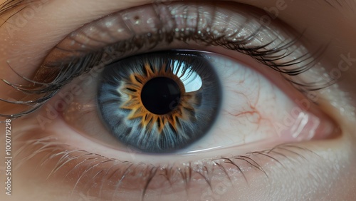 A detailed close-up of a human eye, emphasizing the intricate iris pattern and sharp reflection of light. The texture of the skin around the eye is also visible