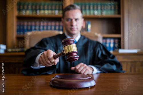 A detailed close-up of a judge’s wooden gavel on a courtroom table, symbolizing law, order, and justice.
