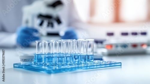 A detailed close-up of a laboratory table showcasing numerous test tubes filled with various liquids, emphasizing a scientific environment.