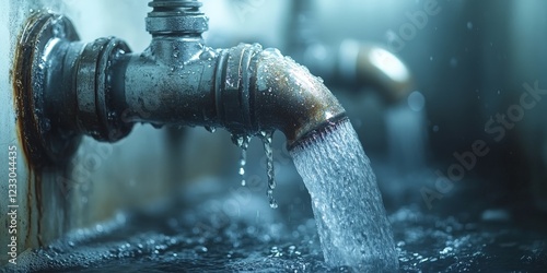 A detailed close-up of a leaking pipe with water splashing, symbolizing maintenance, repair, and infrastructure challenges.