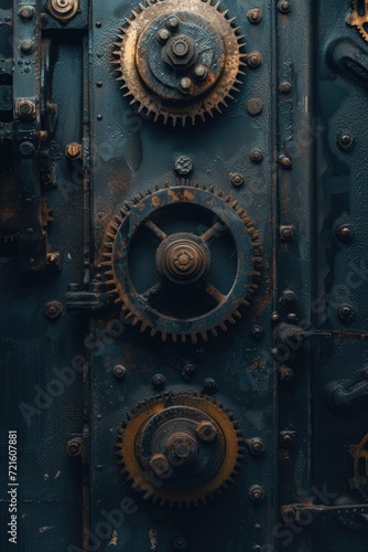A detailed close-up of a metal door featuring intricate gears. This image can be used to represent industrial machinery, mechanical systems, or steampunk aesthetics