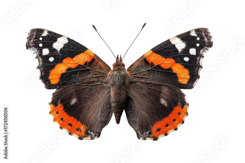A detailed close-up of a Red Admiral butterfly, showcasing its vibrant orange, black, and white patterns against a transparent background. background removed