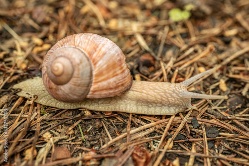 A detailed close-up of a snail crawling on the ground, highlighting its textured shell and body. The background is softly blurred, providing copy space.