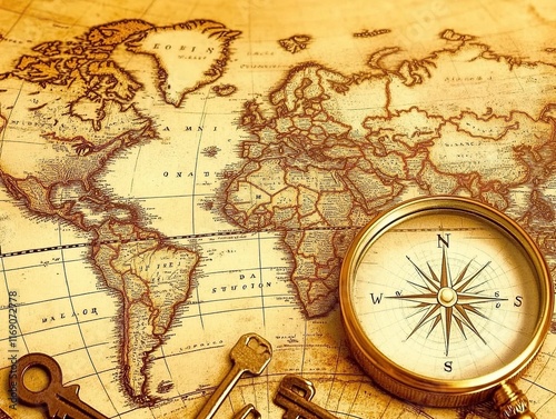 A detailed close-up of a vintage world map laid out on an old wooden table. Surrounding elements include a compass, magnifying glass, and antique keys. Warm sepia tones create a nostalgic atmosphere.