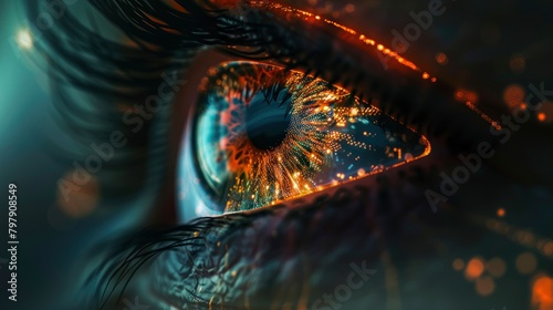 A detailed closeup of an eye with digital elements glowing inside, symbolizing the fusion between traditional vision and futuristic tech in advanced eye care technology.