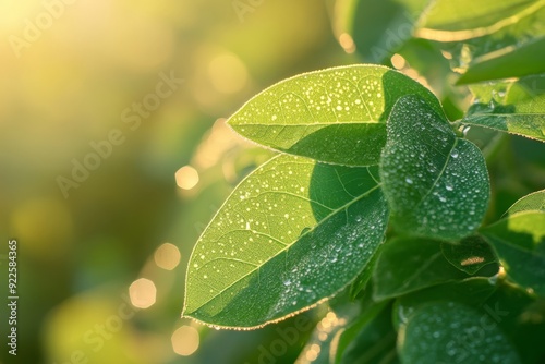 A detailed closeup photo of lush soybean leaves adorned with glistening morning dew, beautifully capturing the freshness, vibrancy, and vitality of nature as it is bathed in soft, warm sunlight