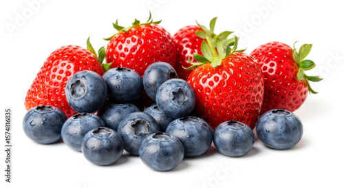 A detailed close-up shot of a fresh mix of ripe strawberries and blueberries with water drops, isolated on a white background