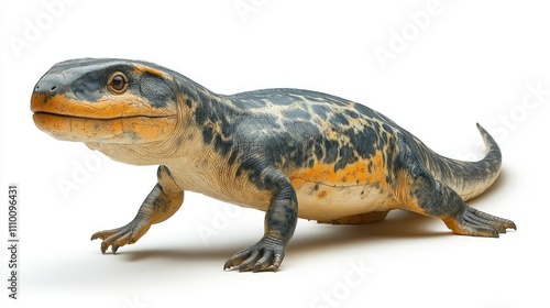 A detailed close-up studio shot of a dimetrodon, an extinct synapsid, against a white background.