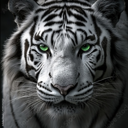 A detailed closeup view of a beautiful white tiger with striking green eyes