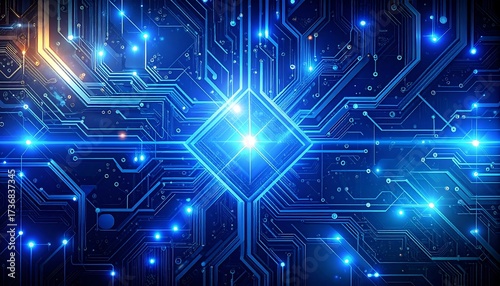 A detailed close-up view of a complex circuit board, highlighted by bright blue light and intricate patterns, showcasing a futuristic and technological aesthetic.