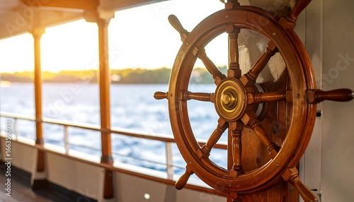 A detailed close-up view of a large wooden ship's steering wheel, set against a blurred backdrop of a tranquil body of water on a sunny day.
